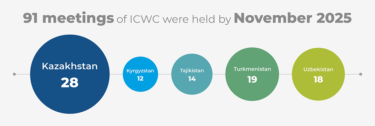 The Interstate Commission for Water Coordination (ICWC) represented by five water ministers or their deputies on parity basis is a body of five governments that have entrusted their respective water ministries (committee) with the functions of managing water resources and maintenaining the sustainability of natural processes along transboundary waters.